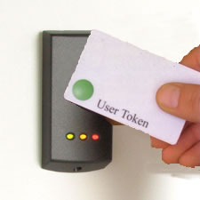 Proximity Card access control system allows users access by having the card near the reader unit. The reader looks up the access permission of the user, LED indicators tell the user if access is granted red for denied access and green for access granted.